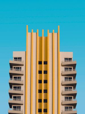 Art Deco tower with its bold yellow columns glowing, crisp lines, and perfect symmetry. Ideal for lovers of minimalist design, geometric forms, and city-inspired wall art.