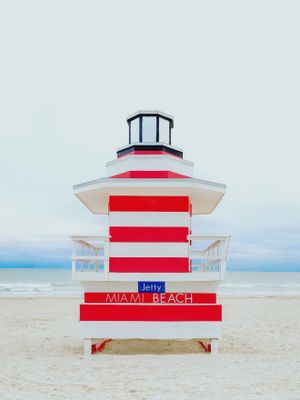 A bright red-and-white striped lifeguard tower stands against soft coastal skies on Miami Beach. Clean lines, playful color, and a perfectly composition capture the iconic charm of Florida’s shoreline. A vibrant, cheerful piece for beach lovers, summer dreamers, and modern coastal decor.