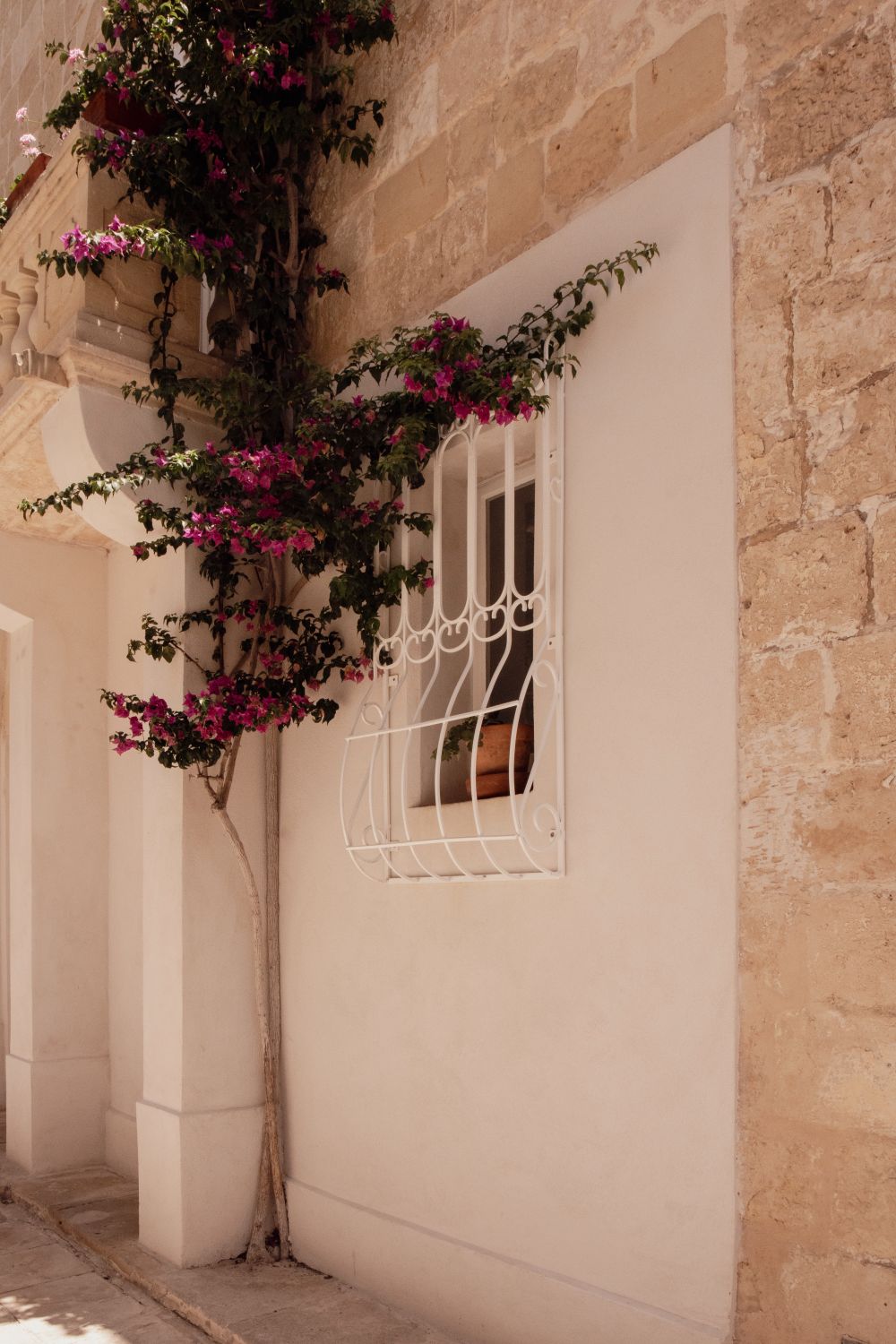 Soft Mediterranean light washes over a white stone facade as vibrant bougainvillea climbs toward a delicate iron-framed window. This fine art architectural photograph captures the quiet beauty of European streets—where texture, warmth, and natural color come together effortlessly.