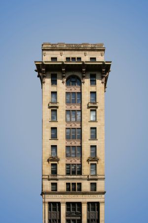 A historic stone tower rises cleanly against a pastel sky, highlighting strong vertical lines, balanced symmetry, and ornate early 20th-century architectural details. Warm stone textures contrast with the open sky, creating a timeless urban composition that emphasizes craftsmanship, proportion, and heritage. This architectural photograph is well suited for fine art prints, editorial features, or modern spaces seeking classic city character with a minimalist aesthetic.