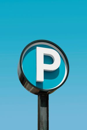 A bold, minimalist photograph featuring a single parking sign set against a clear blue sky. Strong geometry, clean color, and negative space transform an everyday urban symbol into a striking graphic composition.